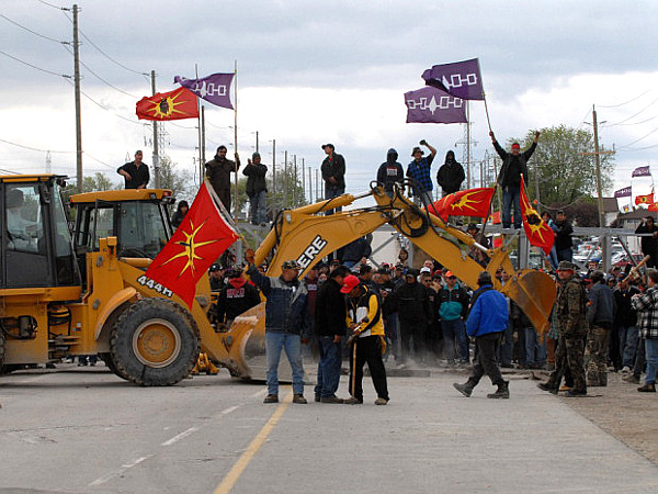 “Hydro One said in a statement that they “have respected the request by the community to stop work {The “community” didn’t “request” it! A criminal gang violently forced it! See below…}. However, they remain hopeful that when outstanding issues are resolved {‘when the bullying Mohawks get their way’}, we can proceed and complete construction of the line.”