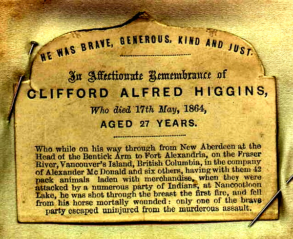 “Chartres Brew, aboard the ‘HMS Sutlej’ — along with the Governor and 38 men — went out again to reach the Chilcoltin from Bentinck Arm. They arrived July 7 and met Cox. Donald McLean led a scouting party to reconnoitre. A guide, hearing a rifle click, urged him to get down. He didn’t, and was shot through the heart.