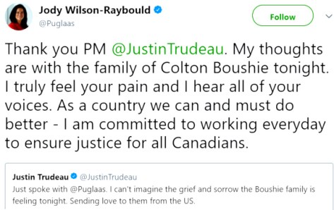 “There soon were signs, however, that the first-time MP and rookie Minister of Justice didn’t fully grasp her responsibilities – including the imperative of absolute impartiality. In early 2018, after a jury acquitted Saskatchewan farmer Gerald Stanley of murdering a young ‘indigenous’ {aboriginal} man named Colten Boushie while defending his property during an attempted robbery, Wilson-Raybould dove into the racially-charged post-verdict controversy by tweeting,