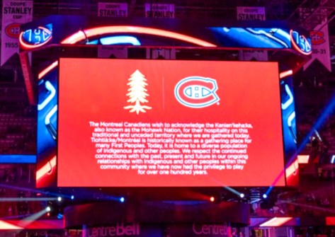 Montreal Canadiens scoreboard shows a ‘land acknowledgement’, Oct. 19, 2021. (Photo by Ryan Remiorz – Canadian Press)